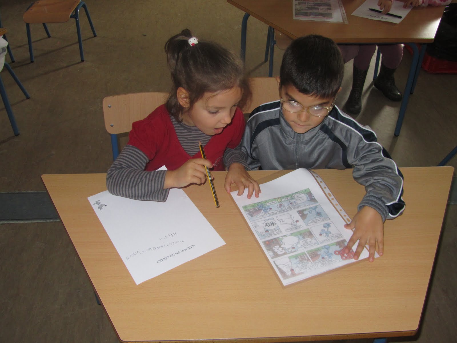 Una vez que nos dimos cuenta de los elementos que caracterizan este tipo de texto decidimos aprender sus nombre, comprobar en nuestros cómics dónde se hallaban y descifrar la información que nos proporcionaba. Así comprobamos que los dibujos de flechas nos indican movimiento, o las estrellas dolor, que cuando alguien no sabe lo que está pasando aparece dentro del bocadillo un signo de interrogación, que hay diferentes tipos de bocadillos que nos indican si el personaje está pensando, gritando y hablando, que podemos escuchar el ruido que hacen los objetos gracias a las onomatopeyas...